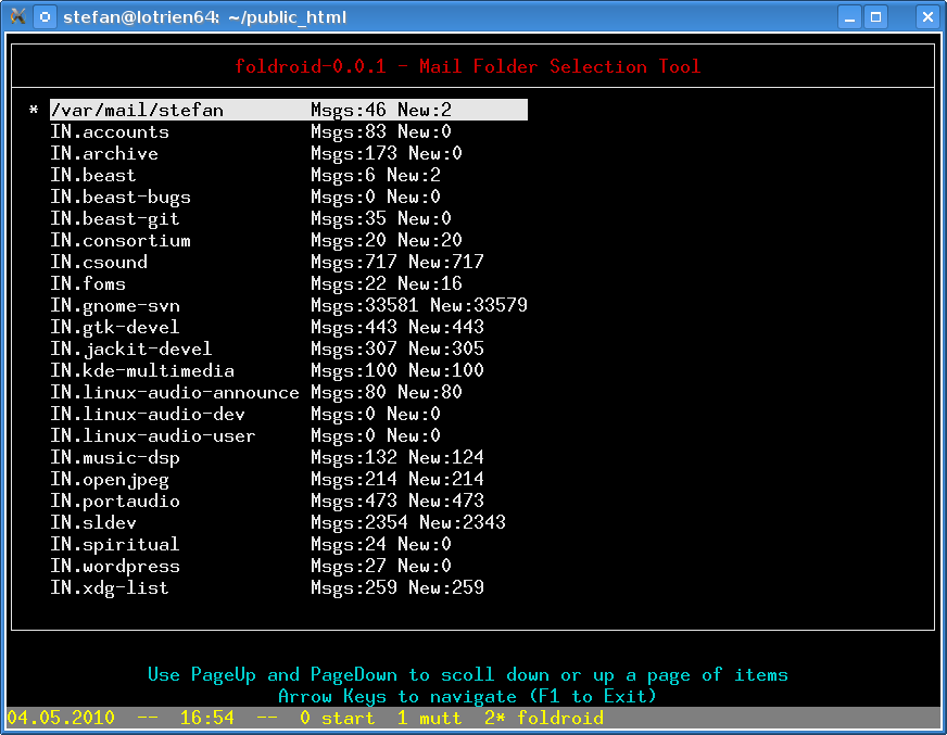 For those (like me) who are using mutt or a similar text mode mail reader, foldroid is a convenient tool to navigate through your mail folders. It shows how many messages are in each folder and how many of them are new. This, combined with a tool like procmail to sort mails of mailing lists into separate folders makes selecting the right folder to run mutt with easy. Foldroid works best when you run it in a screen session, because then, it starts every instance of mutt in its own screen.It is implemented in C++ and licensed under the GNU LGPL version 2